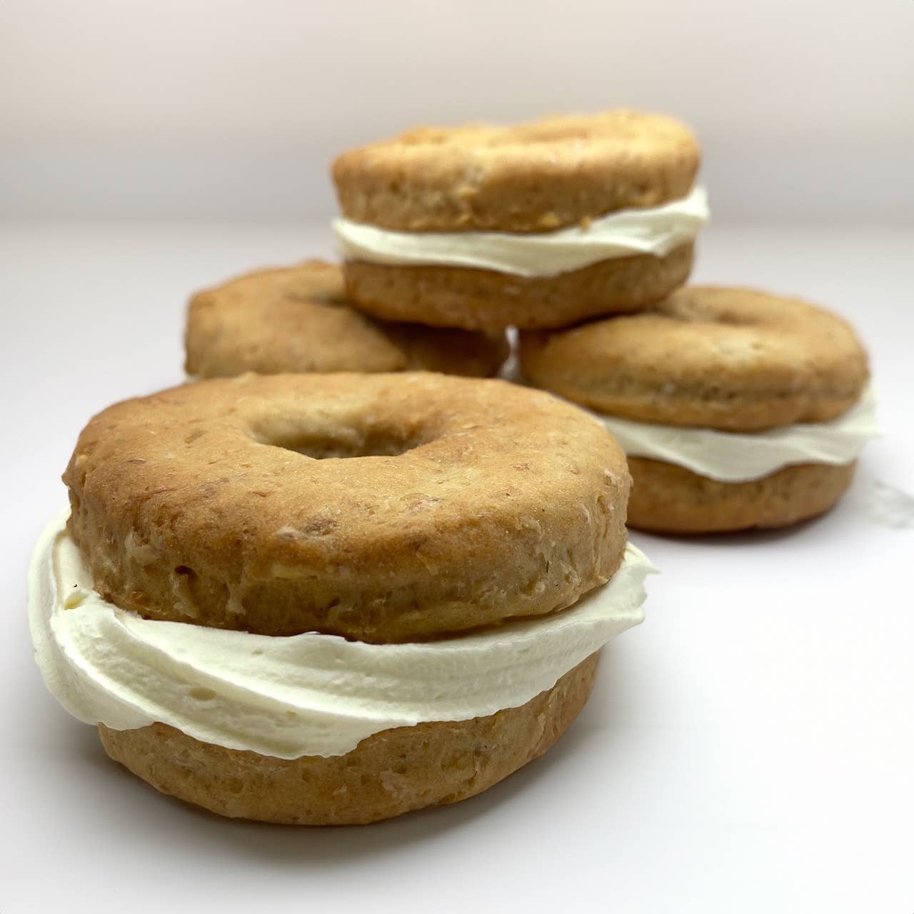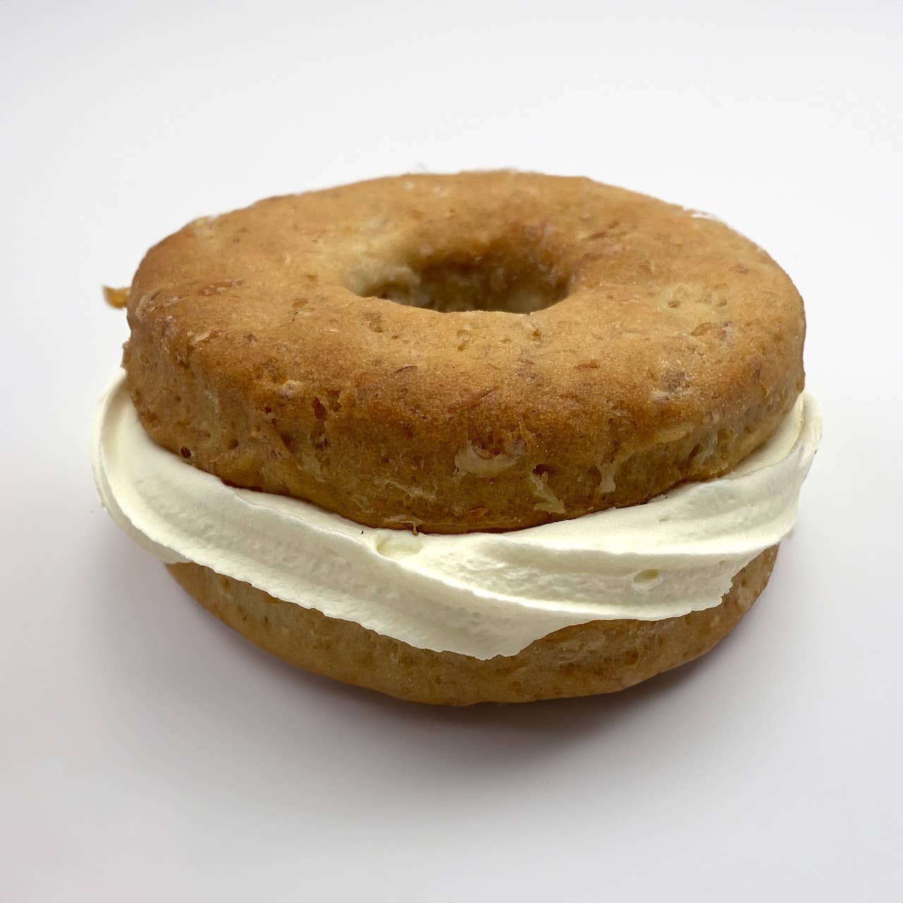 These were a happy accident. We were trying out a new doughnut treat and they didn't come out the way we were hoping. But necessity is the mother of invention and brainstorming with my assistants we noticed they looked like bagels. And add "cream cheese" and you have a sandwich.