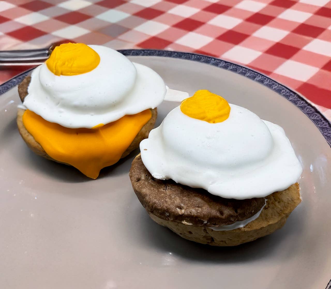 These were a happy accident. We made too many "burgers" for our Sliders So we repurposed them for Eggs and made some thinner patties for the sausage and did our decorating magic for the cheese. And here you have an open face "Poached Egg, Sausage, and Cheese" Sammie.