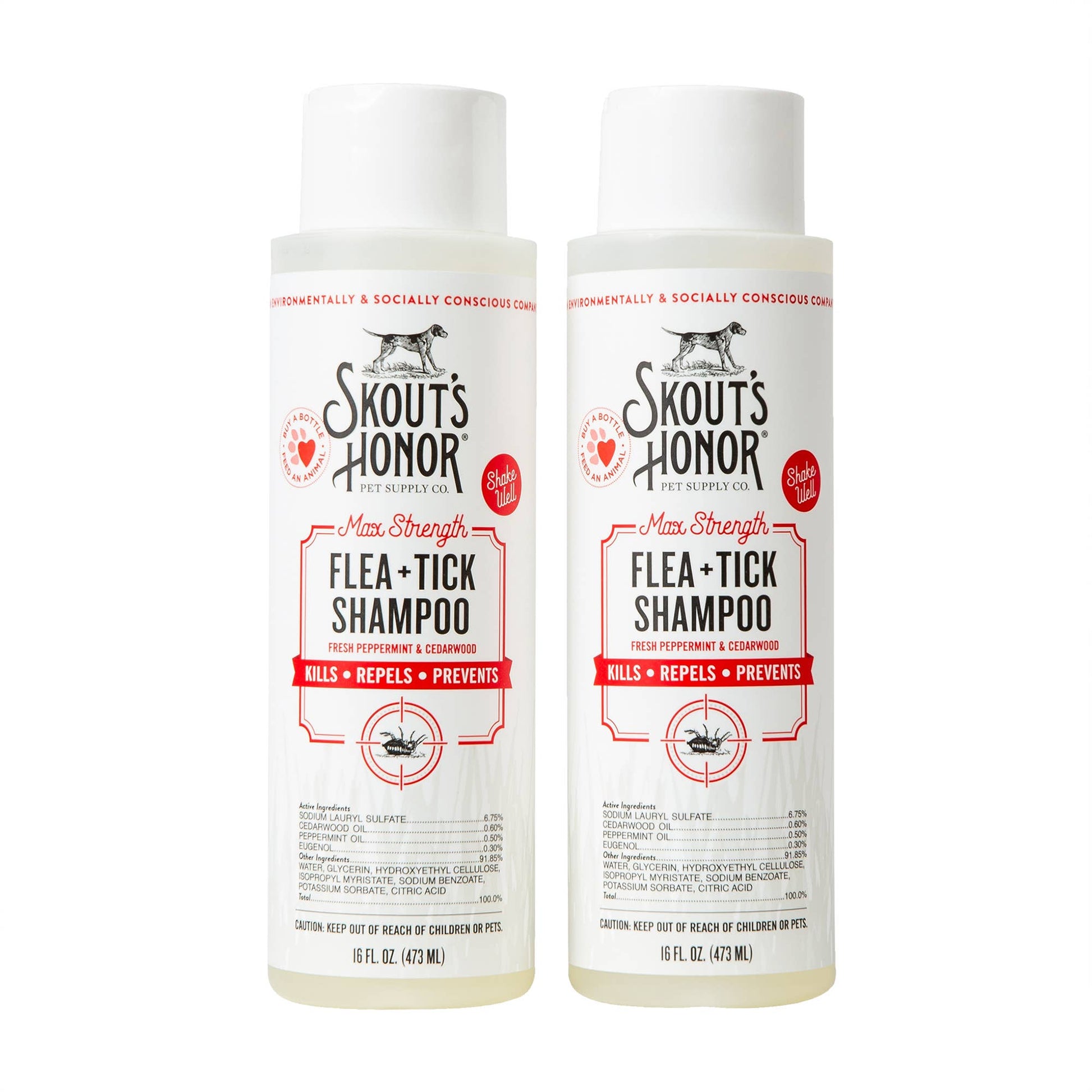 Skout's Honor's Flea + Tick Shampoo contains some of nature's most potent pest-fighting ingredients to eliminate fleas, ticks and repel mosquitos. Not recommended for cats. Skout's Paw Pledge: Together we provide a day's worth of food to an animal in need with every purchase (Buy a Bottle, Feed an Animal).